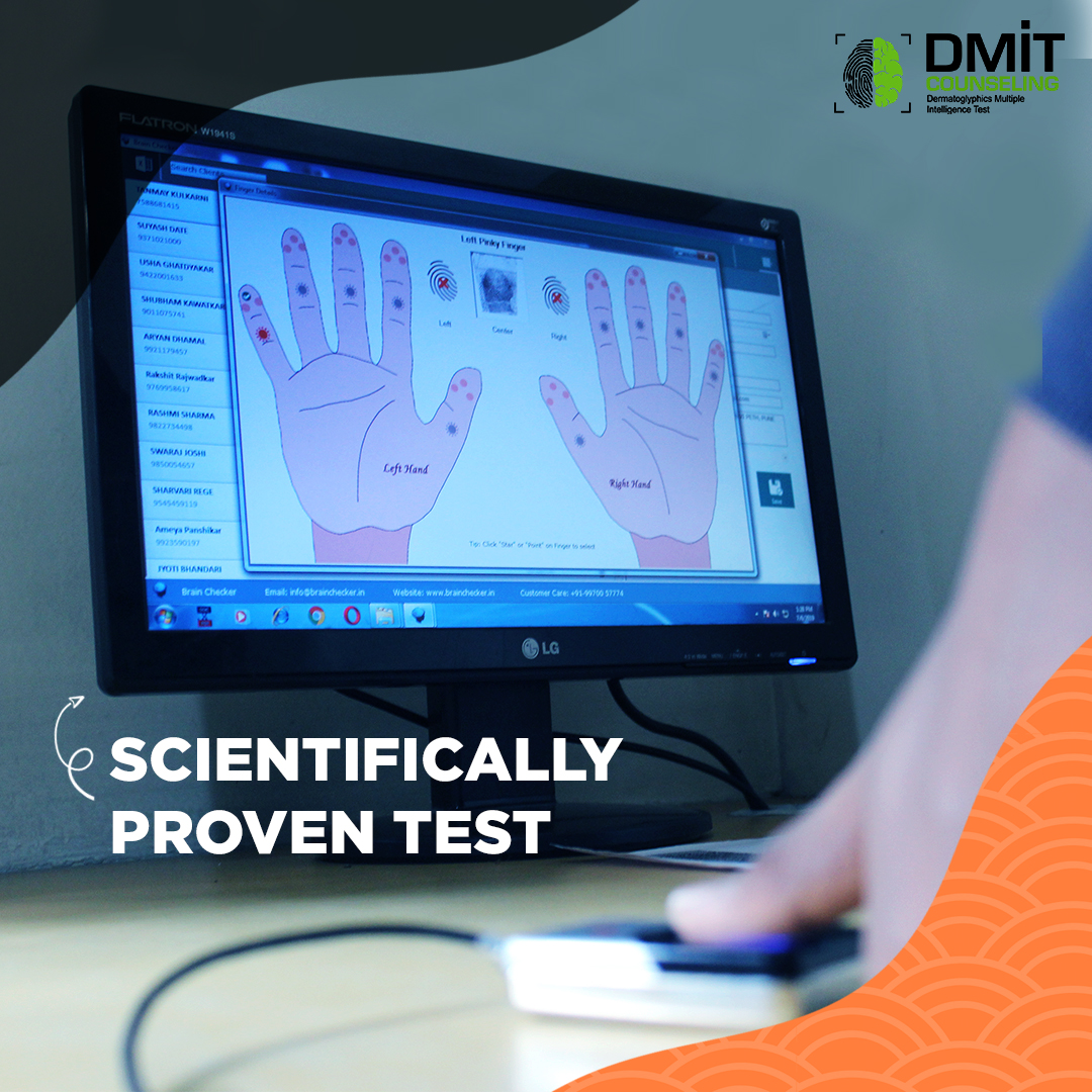 Dermatoglyphics Multiple Intelligences Test (DMIT). DMIT discovers the inborn talent of a child through globally recognized science of DMIT. Report helps a person in choosing his stream ARTS/COMMERCE OR SCIENCE during his studies. It also helps in choosing one’s career say Doctor? Engineer? Artist? Cricketer? Teacher? Designer? Lawyer? Bank Manager? Chartered Accountant? Singer? Musician? Businessman? And so on…..